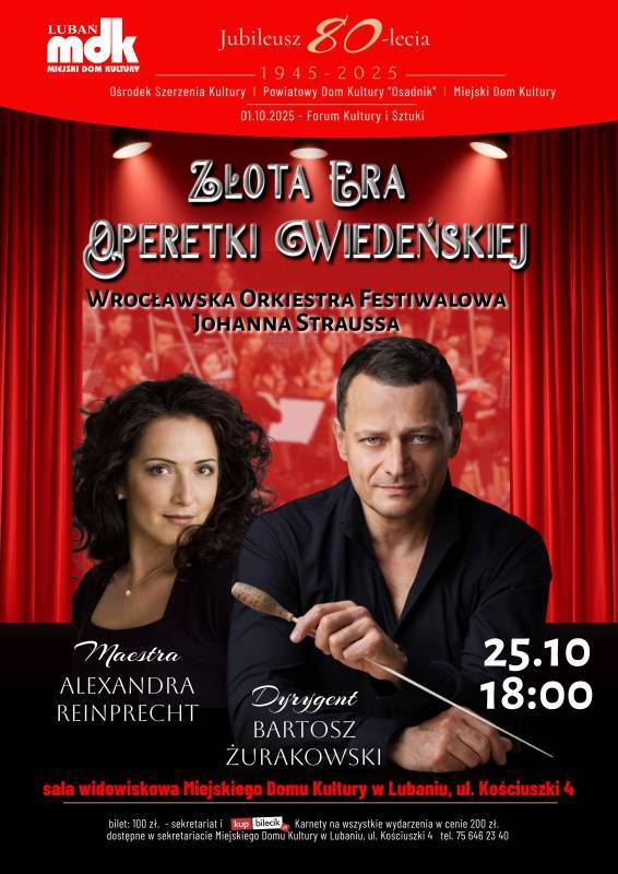 Wieczór z okazji dwusetnej rocznicy urodzin króla Walca - Johanna Straussa z udziałem gwiazdy wiedeńskiej Operetki Alexandry Reinprecht, pod batutą Bartosza Żurakowskiego. To najsłynniejsza i najbardziej pożądana diva operetkowa naszych czasów. Zabrzmią wspaniałe Arie, Pieśni i Piosenki, a także Czardasze. Nie zabraknie porywających Walców, Polek i Marszy. Zapowiada się wyjątkowy, niezapomniany wiosenny spacer po pięknym starym Wiedniu - światowej stolicy muzyki. Żaden inny dyrygent nie potrafił tak dobrze przełożyć swojej kompozytorskiej kreatywności na niezliczone melodie, które dziś znane są na całym świecie jako walce, mazurki i polki. Wielki Johann Strauss skomponował łącznie 16 operetek i niezliczone utwory muzyczne, które nawet 100 lat po jego śmierci nadal fascynują słuchaczy swoją radością. Młoda Orkiestra Festiwalowa im. Johanna Straussa z Wrocławia, która koncertuje w całej Europie, prezentuje na scenie perełki tej geniuszowej twórczości wraz z pierwszorzędnymi solistami. Niezapomniane melodie wiedeńskiej operetki wywołują błogostan. Wystarczy kilka taktów, aby poprawić nastrój. Daj się porwać tej wspaniałej walcowej gorączce.